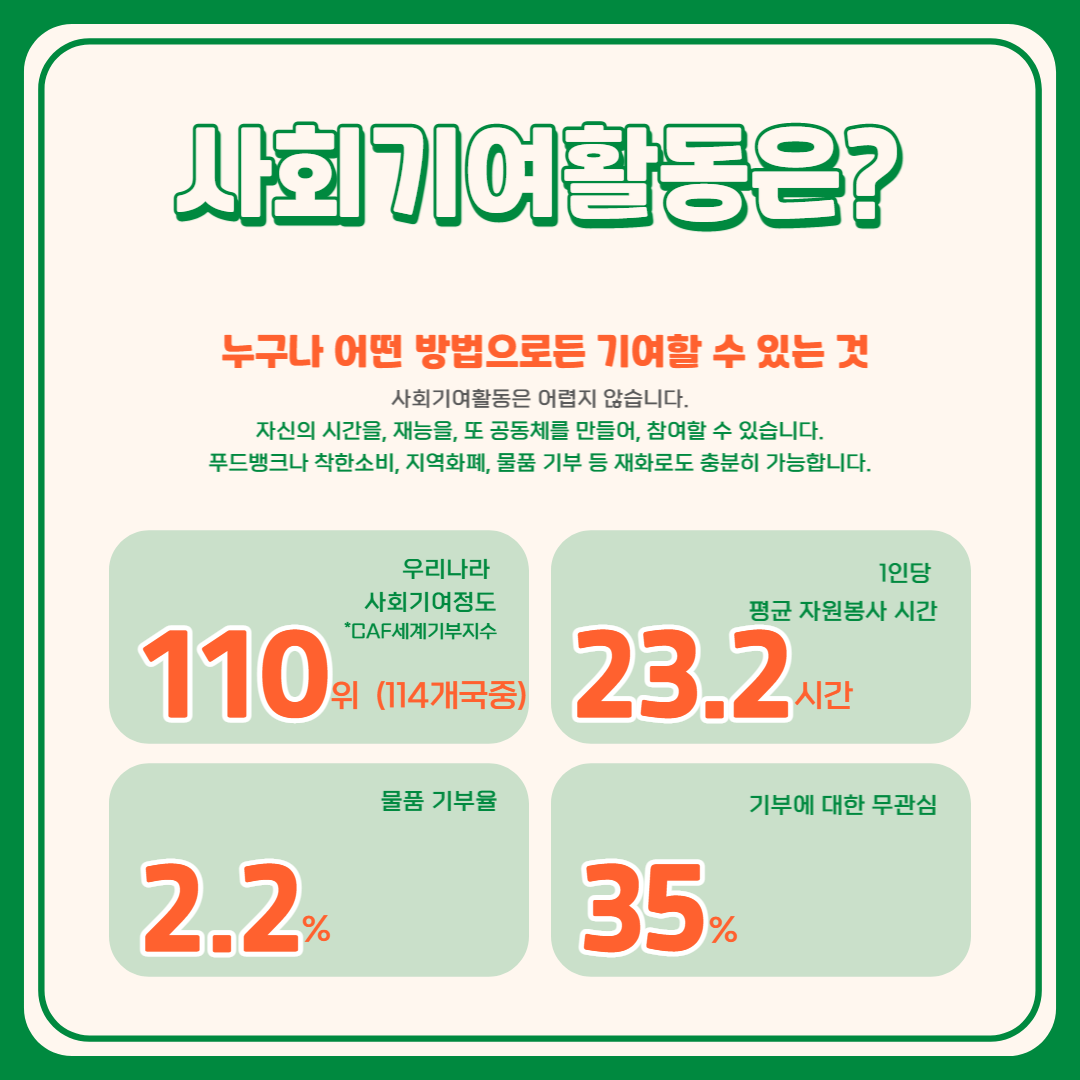 사회기여활동은 사회 가치를 위해 공익을 구현하고 사회를 성장시키는 모든 활동을 말합니다. 이렇게 말하니 너무 거창해 보이나요? 자신의 시간, 재능, 또는 공동체를 만들어 누구나 다양한 방법으로 참여할 수 있습니다. 예를 들어 착한소비, 지역화폐 사용, 물품 기부 등으로 가능합니다.