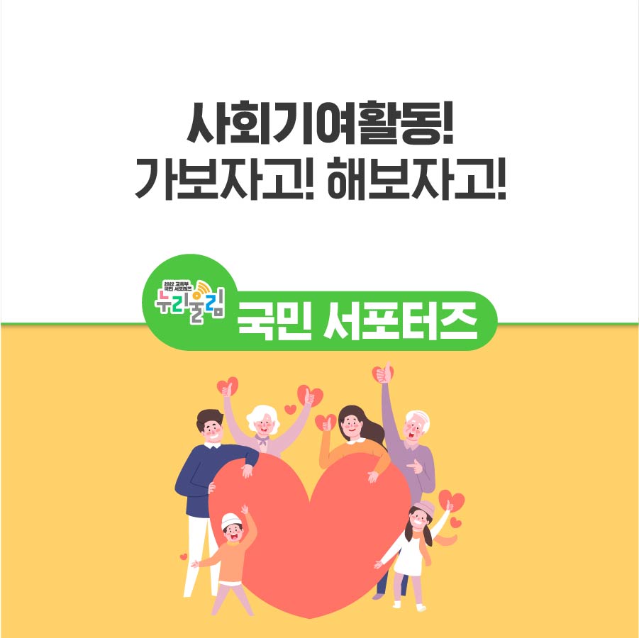 23년 초까지 사회기여활동 참여 방법이 담긴 안내서가 발간될 예정입니다. 또한, 분야‧활동별 시스템을 연계하여 개인별 실적을 일괄 확인할 수 있게 해 참여자 편의를 대폭 향상할 예정입니다.