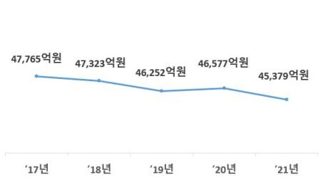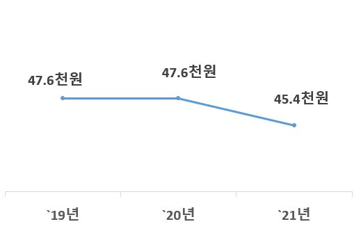 2021년 일반 및 교육대학의 신입생* 평균 입학전형료(결산 기준)는 45.4천원으로 전년(47.6천원)보다 2.2천원(△4.6%) 감소했다.