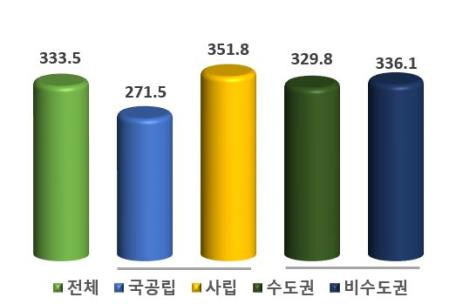 국공립대학은 271.5만원으로 전년(274.6만원)보다 3.1만원(△1.1%) 감소, 사립대학은 351.8만원으로 전년(351.5만원)보다 0.3만원(0.1%) 증가했다. 수도권대학은 329.8만원으로 전년(331.0만원)보다 1.2만원(△0.4%) 감소, 비수도권대학은 336.1만원으로 전년(335.7 만원)보다 0.4만원(0.1%) 증가했다.