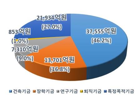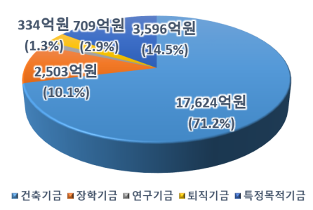 적립금의 구성 비율을 살펴보면, 건축기금(71.2%), 특정목적기금(14.5%), 장학기금(10.1%), 퇴직기금(2.9%), 연구기금(1.3%) 순이었다.