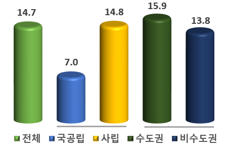 국공립대학의 학자금 대출 이용률은 7.0%로 사립대학(14.8%) 보다 7.8%p 낮았고, 수도권대학은 15.9%로 비수도권대학(13.8%)보다 2.1%p 높았다.