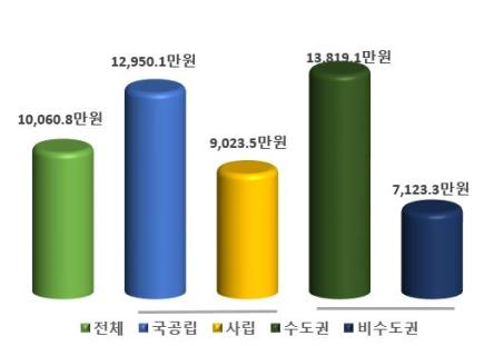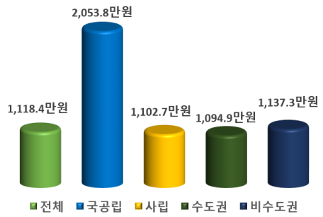 국공립대학은 2,053.8만원으로 전년(1,829.2만원)보다 224.6만원(12.3%) 증가, 사립대학은 1,102.7만원으로 전년(1,025.7만원)보다 77.0만원(7.5%) 증가했다. 수도권대학은 1,094.9만원으로 전년(1,028.9만원)보다 66.0만원(6.4%) 증가, 비수도권대학은 1,137.3만원으로 전년(1,046.6만원)보다 90.7만원(8.7%) 증가했다.