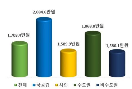 국공립대학은 2,084.6만원으로 전년(1,893.8만원)보다 190.8만원(10.1%), 사립대학은 1,589.9만원으로 전년(1,528.6만원)보다 61.3만원(4.0%) 증가했다. 수도권대학은 1,868.8만원으로 전년(1,804.8만원)보다 64.0만원(3.5%), 비수도권대학은 1,580.1만원으로 전년(1,470.4만원)보다 109.7만원(7.5%) 증가했다.