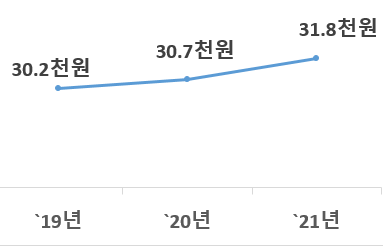 2021년 전문대학의 신입생* 평균 입학전형료(2021년 결산 기준)는 31.8천원으로 전년(30.7천원)보다 1.1천원(3.6%) 증가했다.