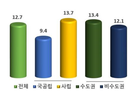 국공립대학의 학자금 대출 이용률은 9.4%로 사립대학(13.7%)보다 4.3%p 낮았고, 수도권대학은 13.4%로 비수도권대학(12.1%)보다 1.3%p 높았다.