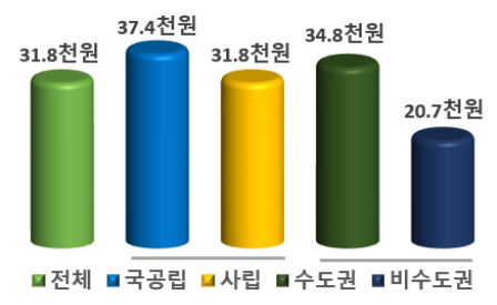 국‧공립대학은 37.4천원으로 전년(9.9천원)보다 27.5천원(277.8%) 증가하였고, 사립대학은 31.8천원으로 전년(30.8천원)보다 1.0천원(3.2%) 증가했다. 수도권대학은 34.8천원으로 전년(33.4천원)보다 1.4천원(4.2%) 증가하였고, 비수도권 대학은 20.7천원으로 전년(22.2천원)보다 1.5천원(△6.8%) 감소했다.