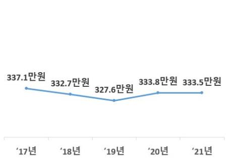 (학생 1인당 장학금) 2021년 일반 및 교육대학의 학생 1인당 장학금*은 연간 333.5만원으로 전년(333.8만원)보다 0.3만원(△0.1%) 감소했다.