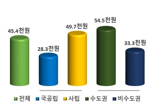 국‧공립대학은 28.3천원으로 전년(30.9천원)보다 2.6천원(△8.4%) 감소하였고, 사립대학은 49.7천원으로 전년(51.2천원)보다 1.5천원(△2.9%) 감소했다. 수도권대학이 54.5천원으로 전년(57.2천원)보다 2.7천원(△4.7%) 감소하였고, 비수도권 대학은 33.3천원으로 전년(35.3천원)보다 2.0천원(△5.7%) 감소했다.