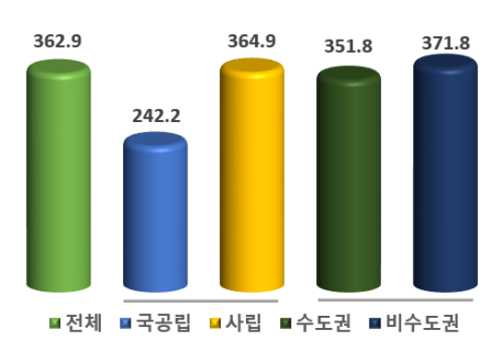 국공립대학은 242.2만원으로 전년(225.2만원)보다 17.0만원(7.5%), 사립대학은 364.9만원으로 전년(364.2만원)보다 0.7만원(0.2%) 증가했다. 수도권대학은 351.8만원으로 전년(358.3만원)보다 6.5만원(△1.8%) 감소, 비수도권대학은 371.8만원으로 전년(364.9만원)보다 6.9만원(1.9%) 증가했다.