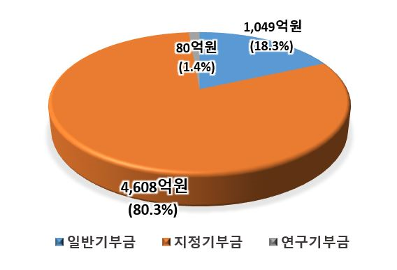 2021년 일반 사립대학의 기부금은 5,737억원(결산 기준)으로 전년(5,596억원)보다 141억원(2.5%) 증가했다. 기부금의 구성을 살펴보면 지정기부금(4,608억원, 80.3%), 일반기부금(1,049억원, 18.3%), 연구기부금(80억원, 1.4%) 순이었다.