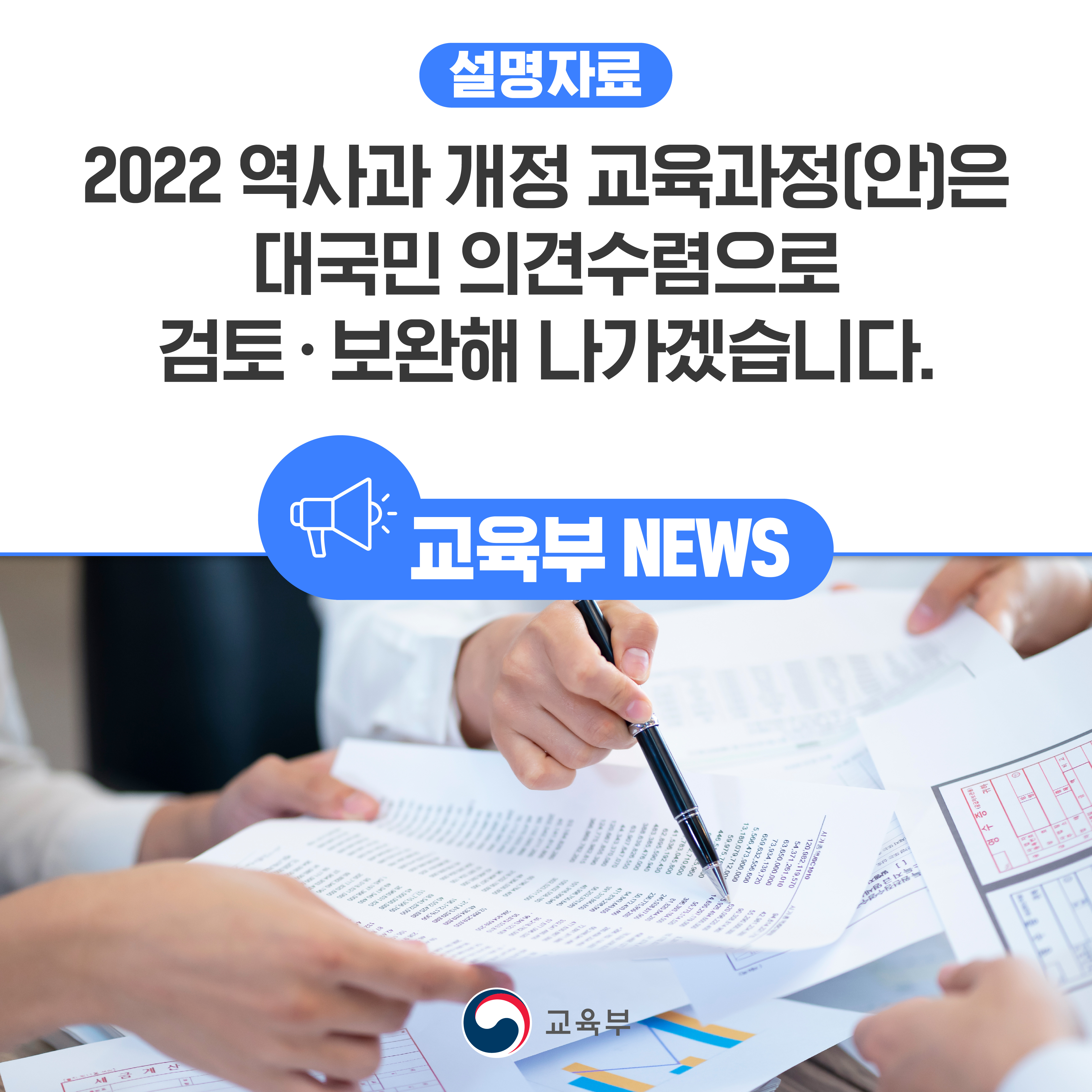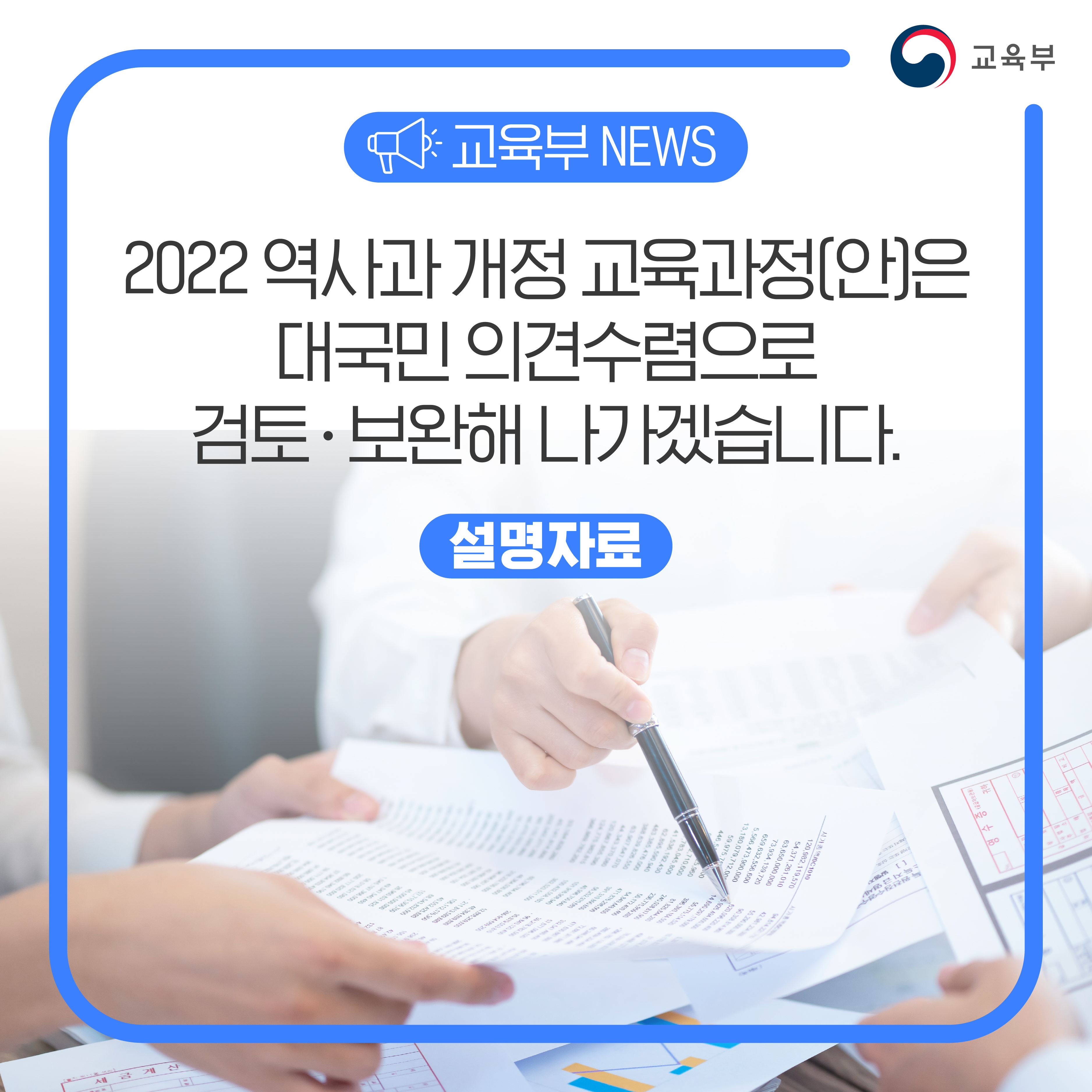 교육부는 지난 8.30.(화) 국민참여 소통채널을 통해 2022 역사과 교육과정(안)을 공개한 바 있습니다.