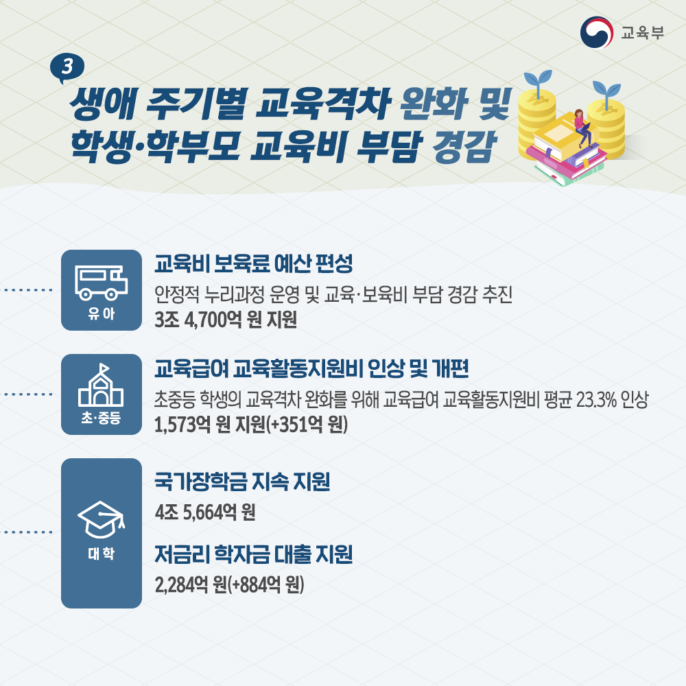 ✓생애 주기별 교육격차 완화 및 학생•학부모 교육비 부담 경감