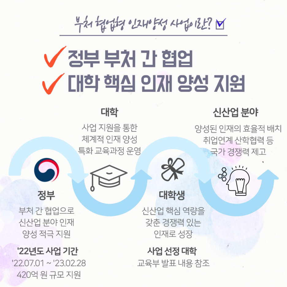 여러분은 ‘부처 협업형 인재양성 사업’에 대해 들어보신 적이 있나요? 최근 반도체 분야 인재양성과 관련된 뉴스를 접한 분이라면 들어보신 적이 있을 것 같습니다.