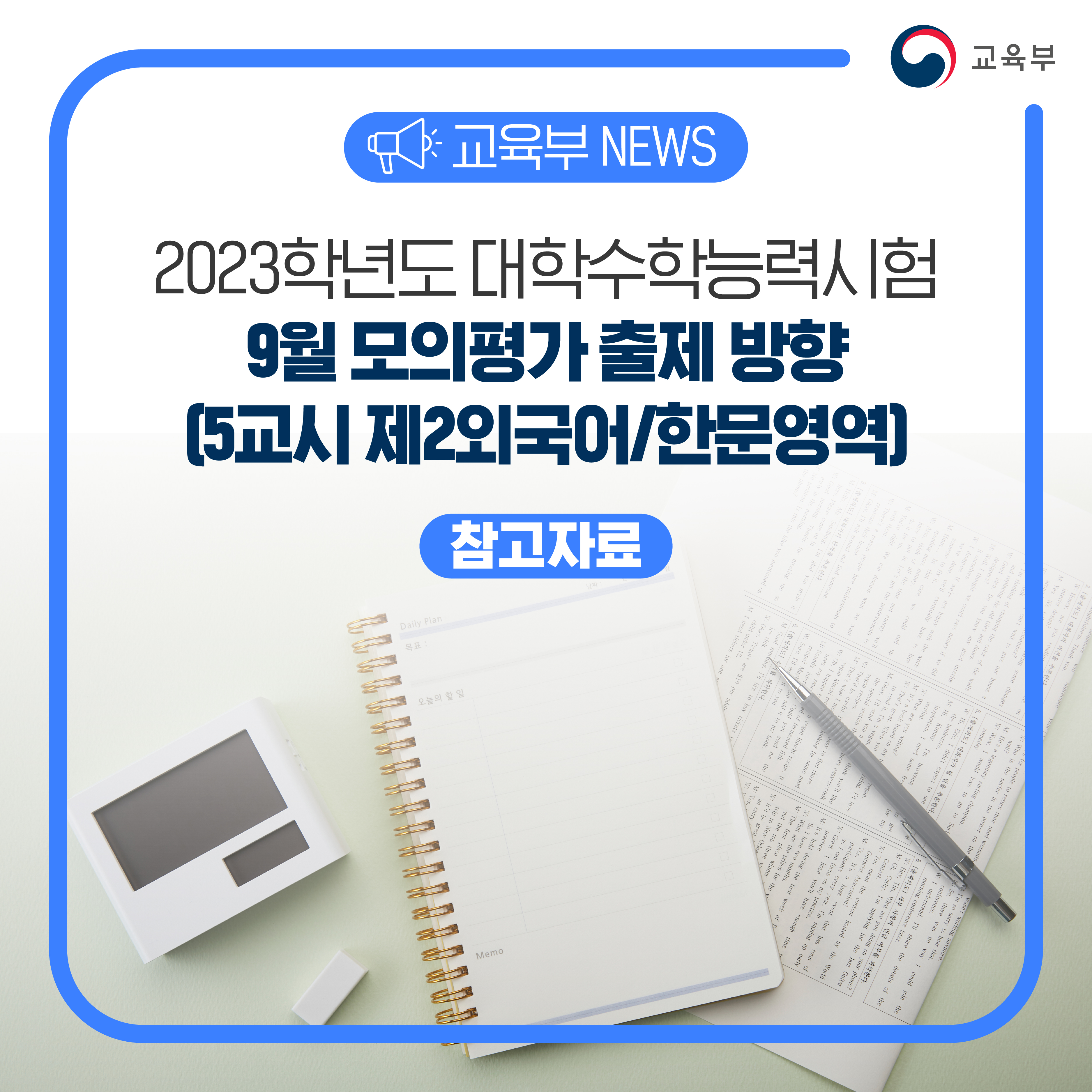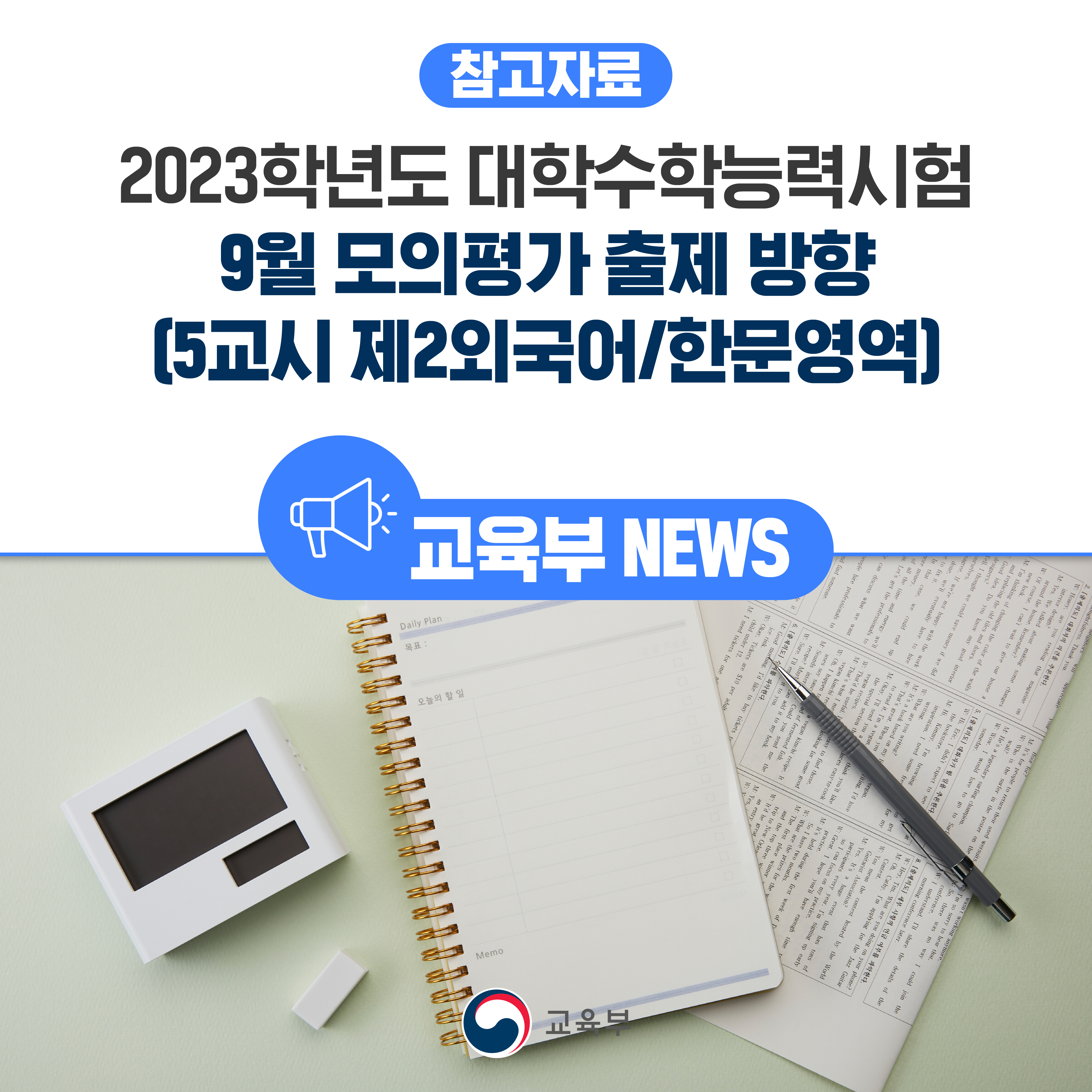| 2023학년도 대학수학능력시험 9월 모의평가 출제 방향_3교시 영어영역 (0) | 2022.08.31 |