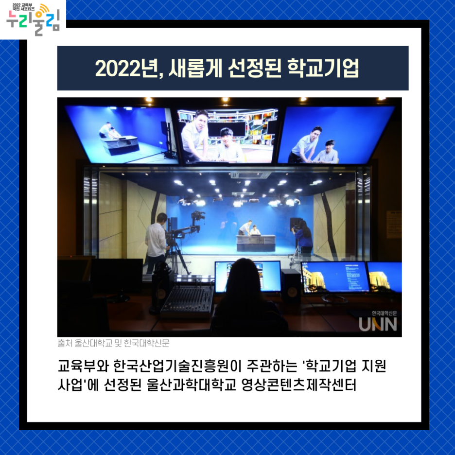 신규 학교기업 중 하나인 울산과학대학교는 학교기업인 영상콘텐츠 제작센터를 통해 디지털콘텐츠 디자인학과 학생들이 현장실습에 참여하며, 울산의 혁신기관 정책 방향에 맞춰 산업안전, 문화관광, 보건의료 등 지역산업과 연계한 영상콘텐츠 산업을 육성할 계획이라고 합니다.