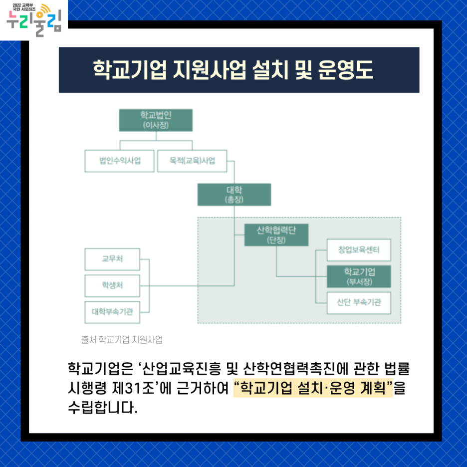 학교기업을 설치하기 위해서는 ‘산업교육진흥 및 산학연협력촉진에 관한 법률 시행령 제31조’에 근거하여 “학교기업 설치·운영 계획”을 수립해야 합니다. 위와 같은 절차를 통해 설치된 학교기업은 독립된 법인격을 갖지 못하기 때문에 학교 또는 산학협력단의 소속 부서로서 존재합니다.
