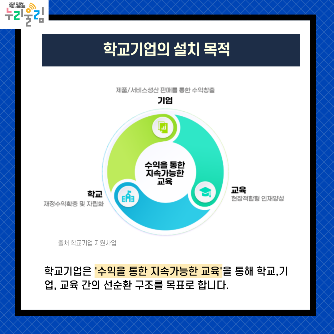 학교기업 지원사업은 학교기업을 통해 학생들에게 체계적 현장실습 기회를 제공하고, 그 과정에서 창출된 수익이 교육에 재투자되는 선순환 체계를 구축할 수 있도록 지원하는 사업입니다.