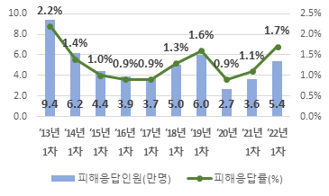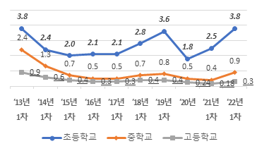 조사 결과, 피해 응답률은 1.7%(5.4만 명)로 2021년 1차 조사 대비 0.6%p 증가했으며, 코로나19감염병 확산 이전 실시된 2019년 1차 조사 대비 0.1%p 증가했다. 학교급별로는 초등학교 3.8%, 중학교 0.9%, 고등학교 0.3%로 나타나, 모든 학교급에서 2021년 1차 조사 대비 증가하는 양상을 보였다.