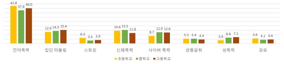 - 언어폭력(41.8%), 신체폭력(14.6%), 집단따돌림(13.3%) 순