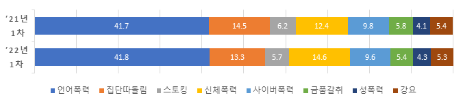 한편, 피해유형별 응답 비중은 언어폭력(41.8%), 신체폭력(14.6%), 집단따돌림(13.3%) 순으로, 이는 2021년 1차 조사 대비 집단따돌림(14.5%→13.3%), 사이버폭력(9.8%→9.6%)의 비중은 감소하고, 신체폭력(12.4%→14.6%)의 비중은 증가한 수치이다.