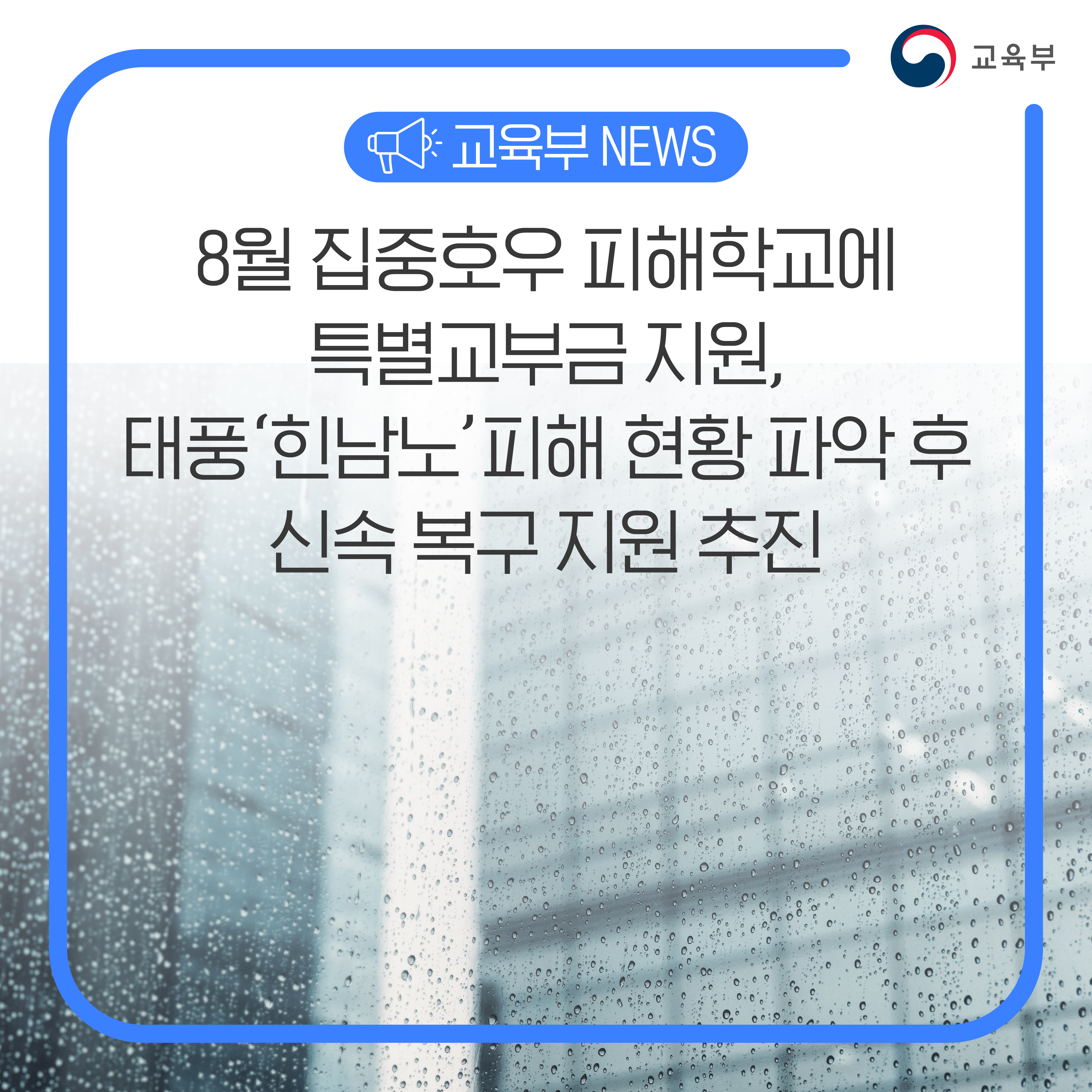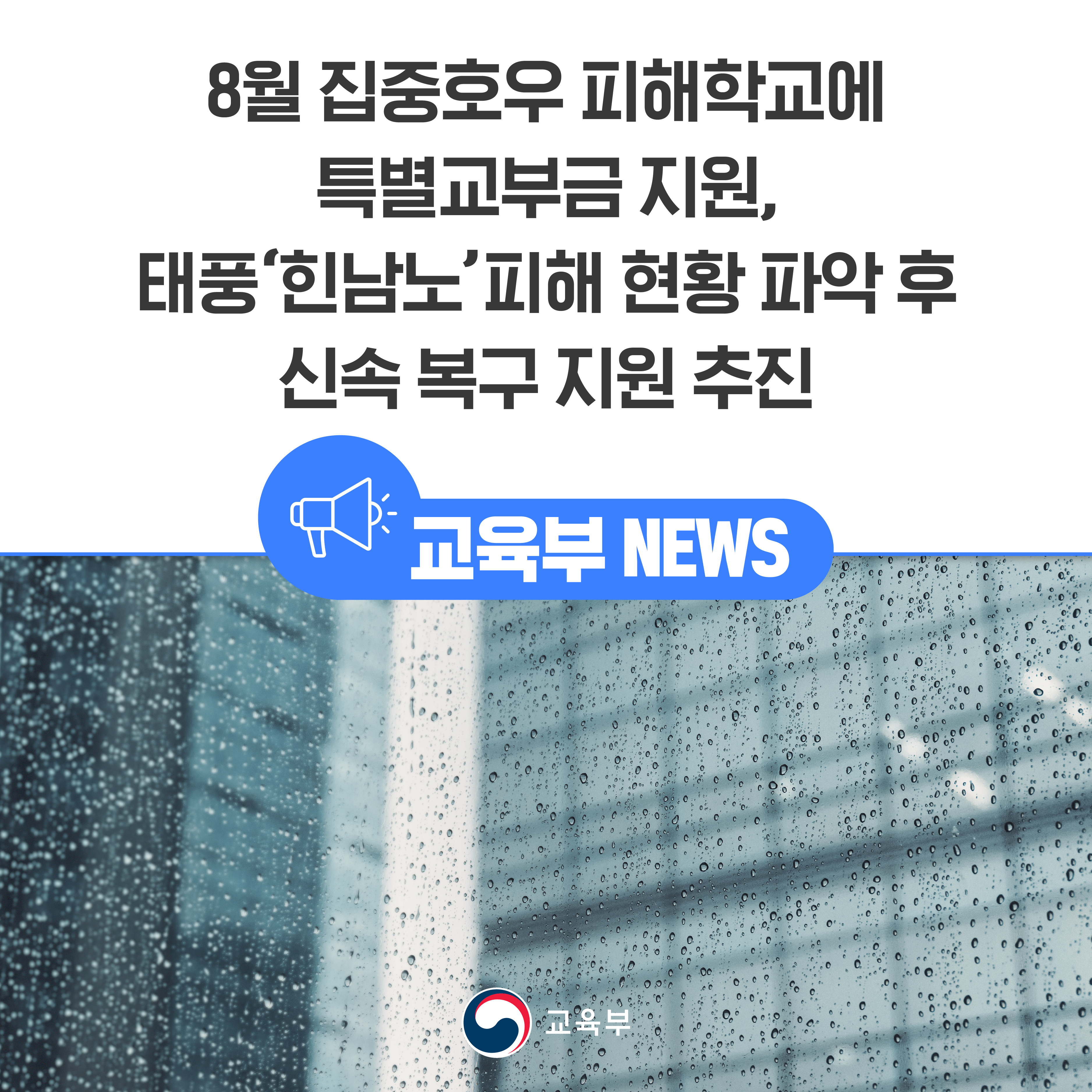 교육부는 지난 8월 집중호우로 발생한 피해를 신속하게 복구하고 추가 피해를 예방할 수 있도록 재해대책 특별교부금 8,622백만 원(35개교)을 지원하였다.