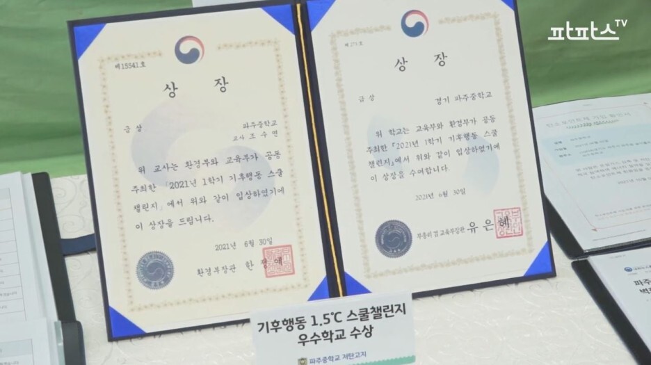2022년 탄소중립 중점학교와 2022년 꿈꾸는 환경학교로 선정된 파주중학교는 ‘기후행동 1.5℃ 스쿨 챌린지’를 학교 전 구성원이 적극적으로 참여했습니다. 스쿨 챌린지는 기후행동 1.5℃ 앱을 통해 지구의 온도를 낮추는 기후 행동을 적극적으로 실천한 학생과 학교를 선정하는 활동입니다.