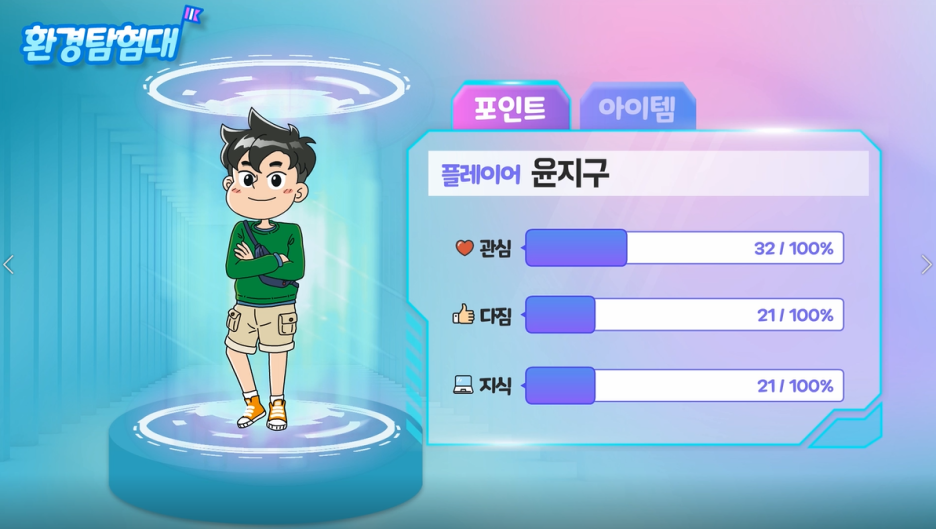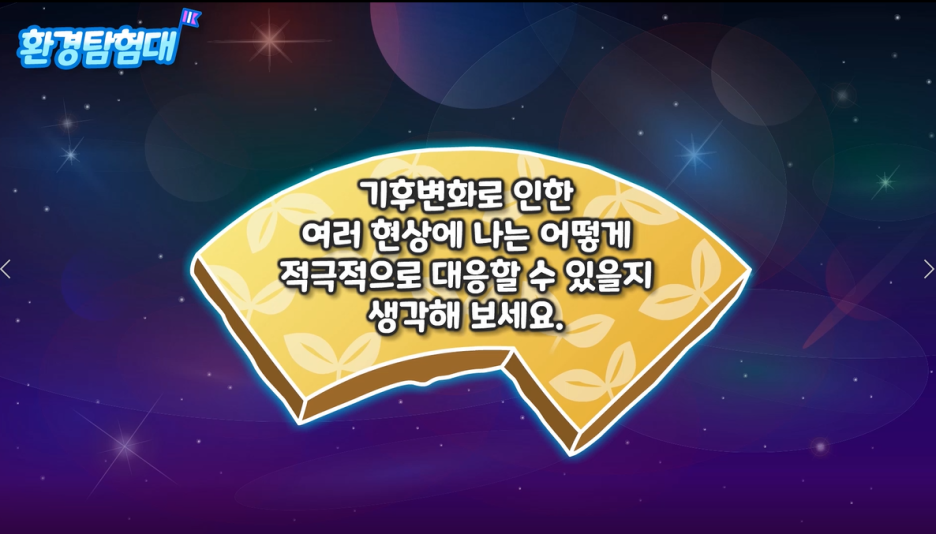 ▶ 교사는 학생들이 기후·환경 관련 임무(퀴즈)를 수행하며 점수를 쌓아가는 게임 형식의 교수학습자료인 ‘환경탐험대’(정보센터 ‘수업 동영상’ 메뉴 내 탑재)를 활용하여, ‘인간과 환경과의 상호의존성’을 핵심주제로 수업을 진행할 수 있다. |