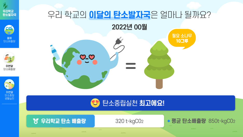 특히, 각 학교는 학교환경교육정보센터 내 탄소발자국 모니터링 메뉴를 통해 학교에서 배출하는 탄소량을 학교 현관 등에 설치된 모니터로 직접 확인하고, 이를 활용하여 학생, 교사 등 학교구성원들은 온실가스 감축목표를 함께 수립하고 실천해 나갈 수 있다.