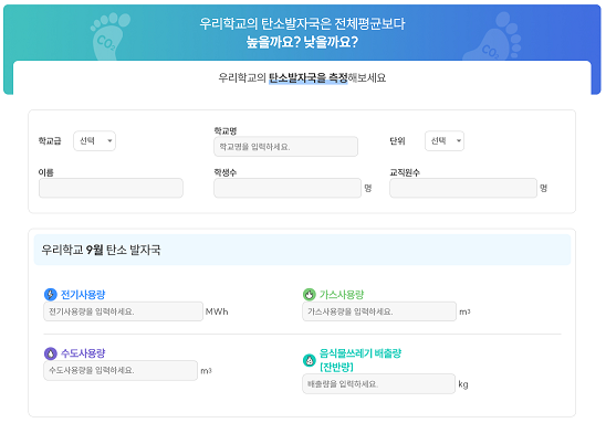 일반학교는 해당 메뉴에 학생 수, 교직원 수, 탄소발자국(전기, 가스, 수도 사용량 및 음식물쓰레기 배출량)을 입력하면 얼마나 탄소를 발생하고 있는지 측정하고, 어떠한 감축 활동을 실천해야 하는지 알 수 있다.