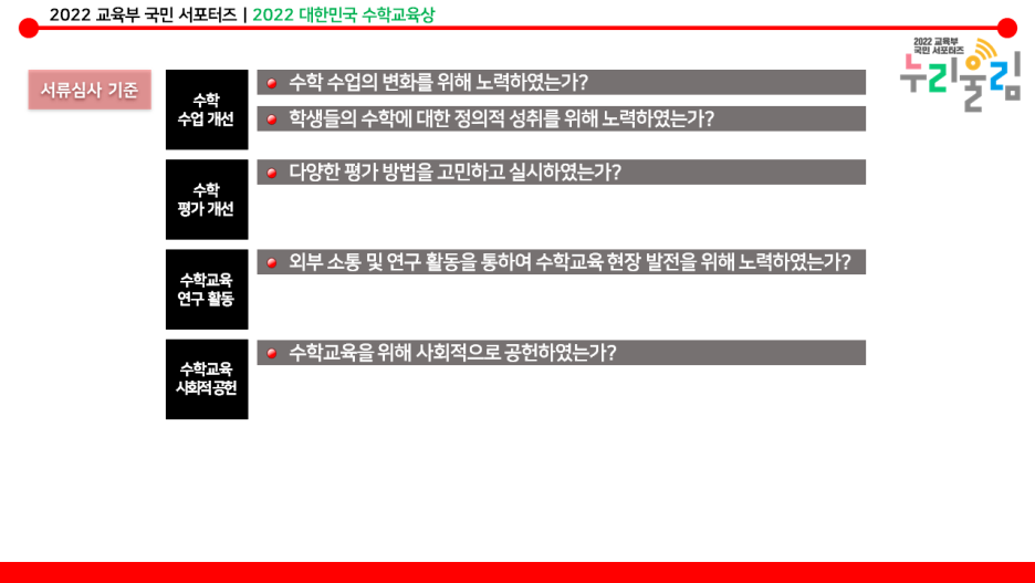 여러분 ‘대한민국 수학교육상’을 들어보셨나요? 교육부 주최, 한국과학창의재단이 주관하는 대한민국 수학교육상은 수학교육 발전에 공헌한 교원을 발굴·시상해 교원의 자긍심을 높이고 우수사례를 확산함으로써 수학교육 내실화를 추구하기 위해 시행하고 있습니다.