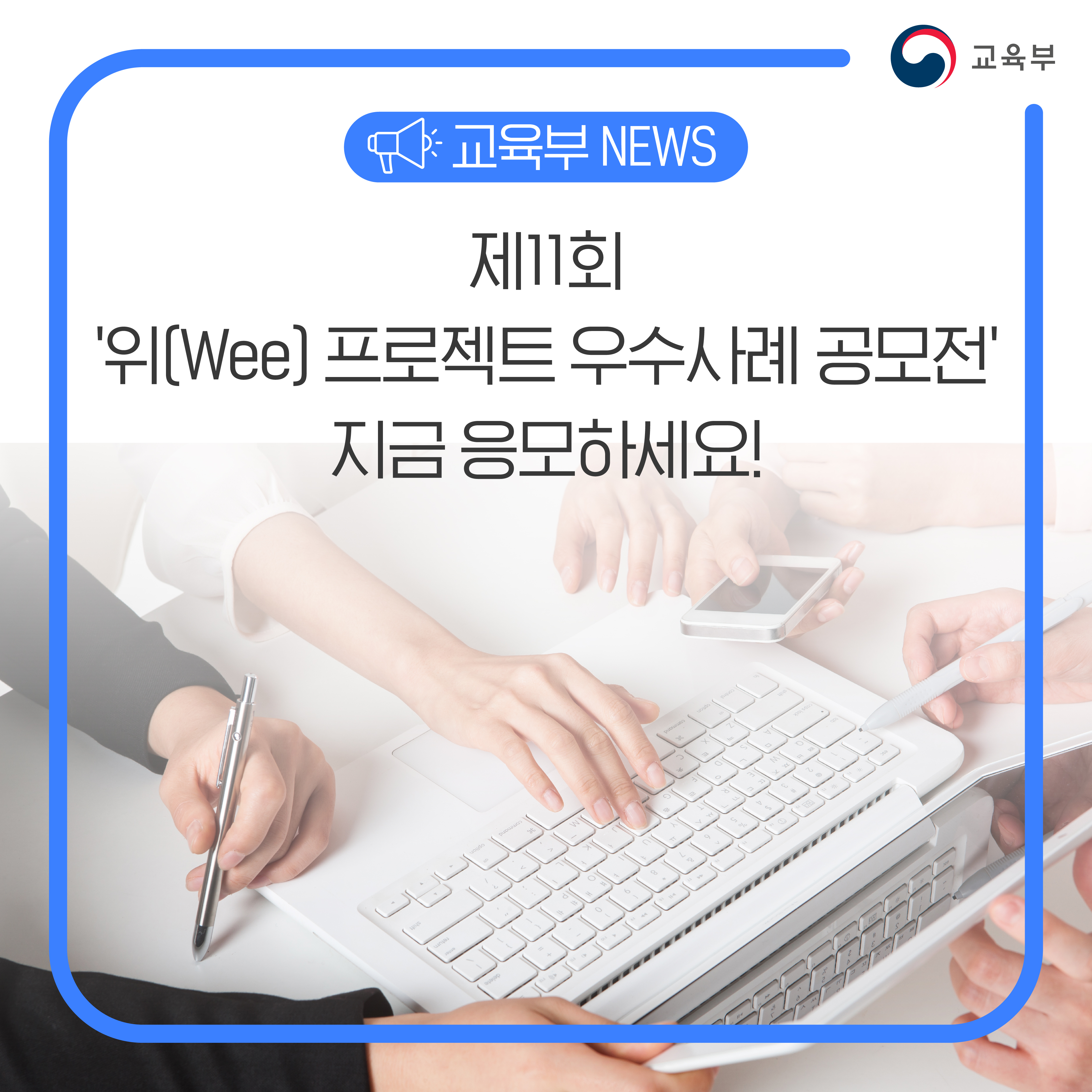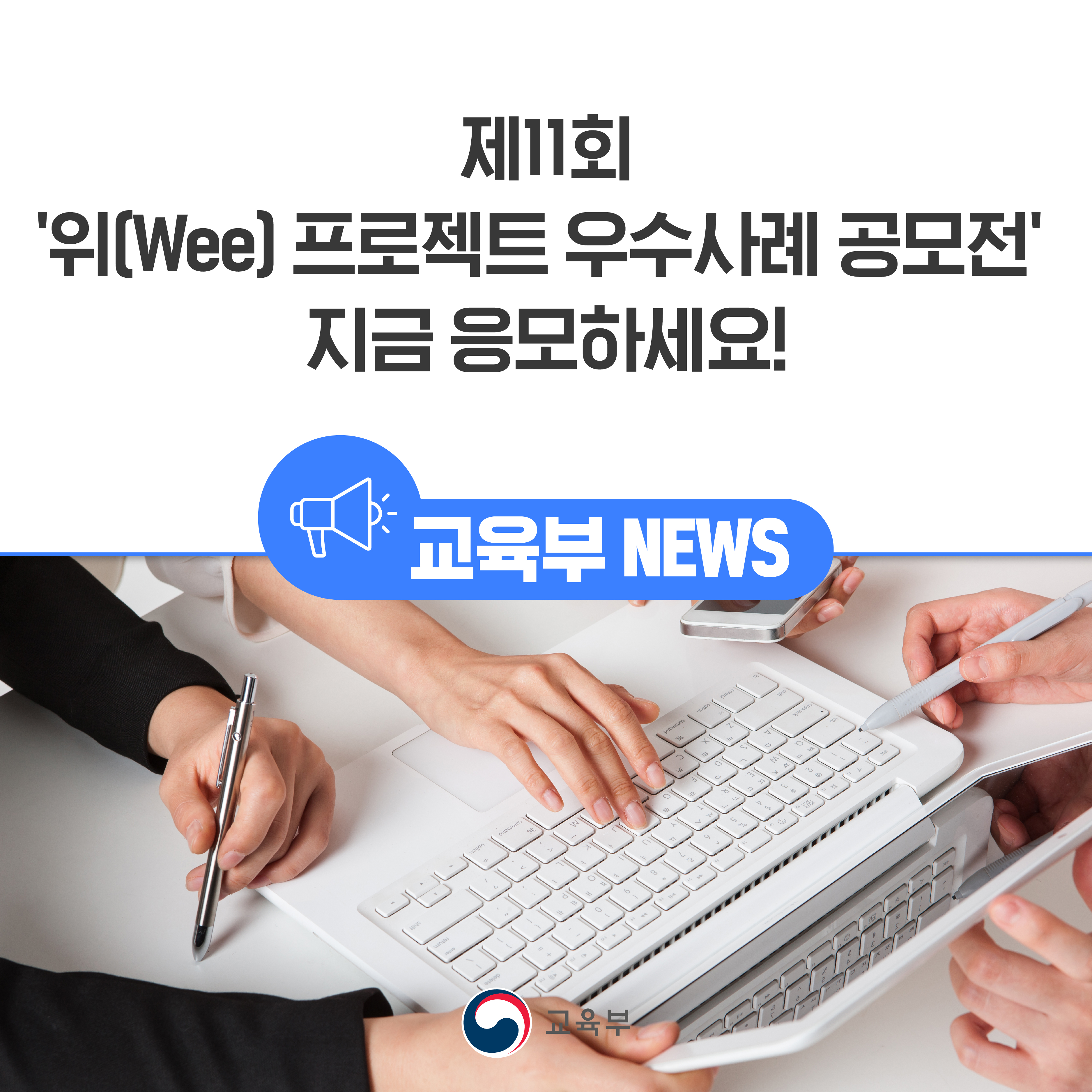 교육부는 위(Wee) 프로젝트의 우수한 운영사례를 발굴하고 성과를 확산하기 위하여 ‘제11회 위(Wee) 프로젝트 우수사례 공모전’을 개최한다.