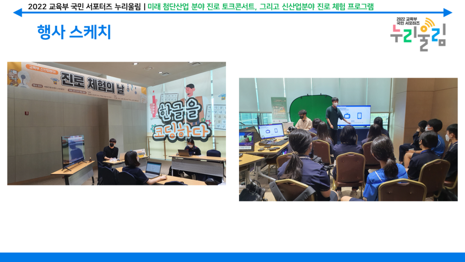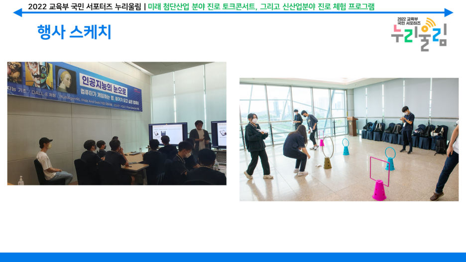 참여한 학생들은 미래 첨단산업 분야에 대한 진로 탐색과 해당 분야에 필요한 역량을 경험하며 미래 사회가 요구하는 인재에 대해 생각해 볼 수 있었습니다. 오늘은 아쉽게 참여하지 못한 분들을 위해 국민 서포터즈가 직접 방문 후기를 소개해 드리고자 합니다.