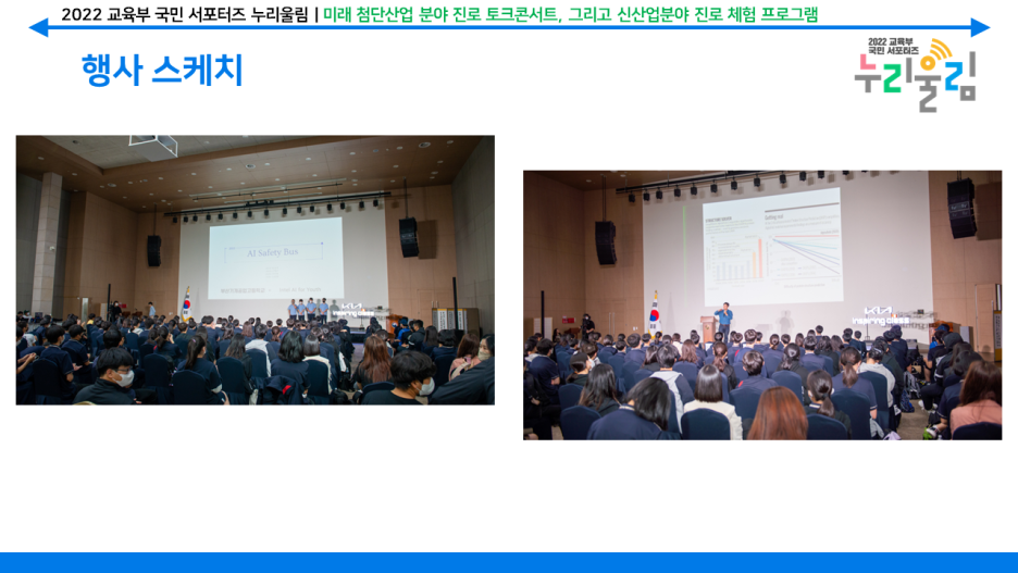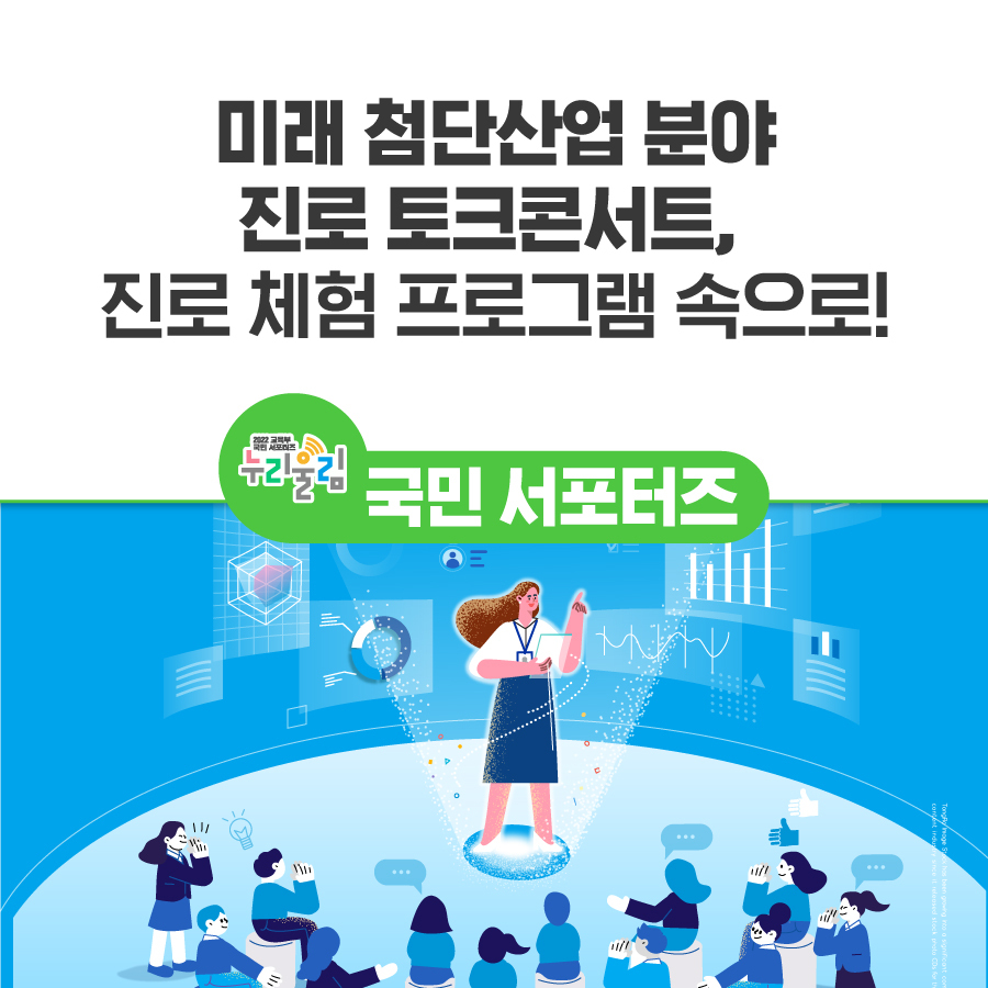 국민 서포터즈도 이번 미래 첨단산업 분야 진로 토크콘서트, 진로 체험프로그램을 통해 빠르게 변화하는 미래를 대비하고 준비하는 자세에 대해 알게 된 시간이었습니다. 미래 사회를 준비하는 모든 학생이 변화의 바람에 휩쓸리지 않는 자신만의 튼튼한 울타리를 만들게 되길 바랍니다.