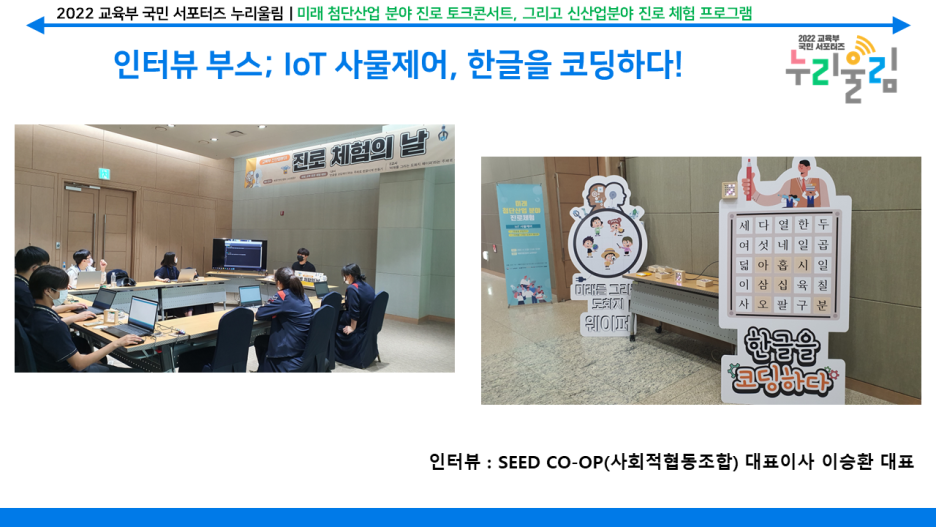 그럼, 이번 부스를 운영한 분들의 인터뷰를 들어보겠습니다. 먼저 “IoT 사물제어, 한글을 코딩하다”라는 부스를 운영한 이승환 대표님입니다.