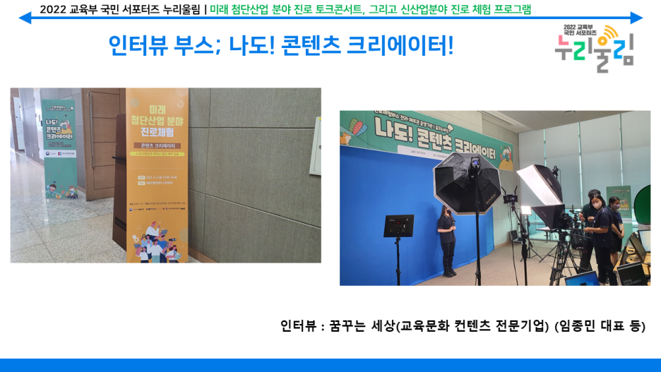 A. (임종민 대표) 저희 부스는 콘텐츠 크리에이터를 소개하며, 학생들 스스로가 미디어 제작과정부터 마지막 편집과 미디어에 송출되는 모습까지 경험할 수 있는 프로그램으로 구성되었습니다. 세부적으로는 촬영감독과 연출가, 작가의 역할을 소개하고 프로그램 속 사회자의 역할과 출연진들은 각각의 상황에서 어떻게 진행해야 하는지를 알아가는 내용입니다.