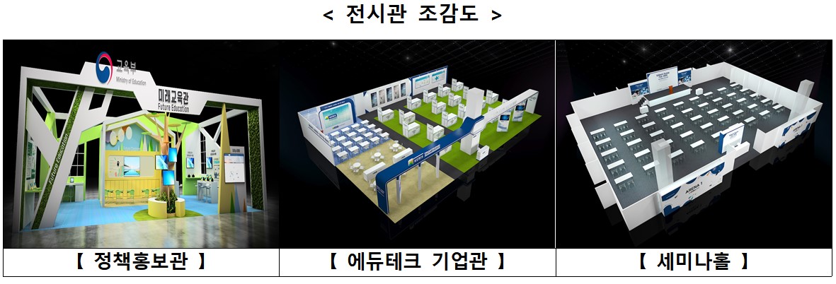 교육부 정책홍보관에서는 새로운 교육기술(에듀테크)을 활용한 다양한 수업장면을 관람할 수 있으며, 확장가상세계(메타버스)와 연계된 디지털교과서, 인공지능을 활용한 초등수학 수업 지원시스템 등을 체험할 수 있다.