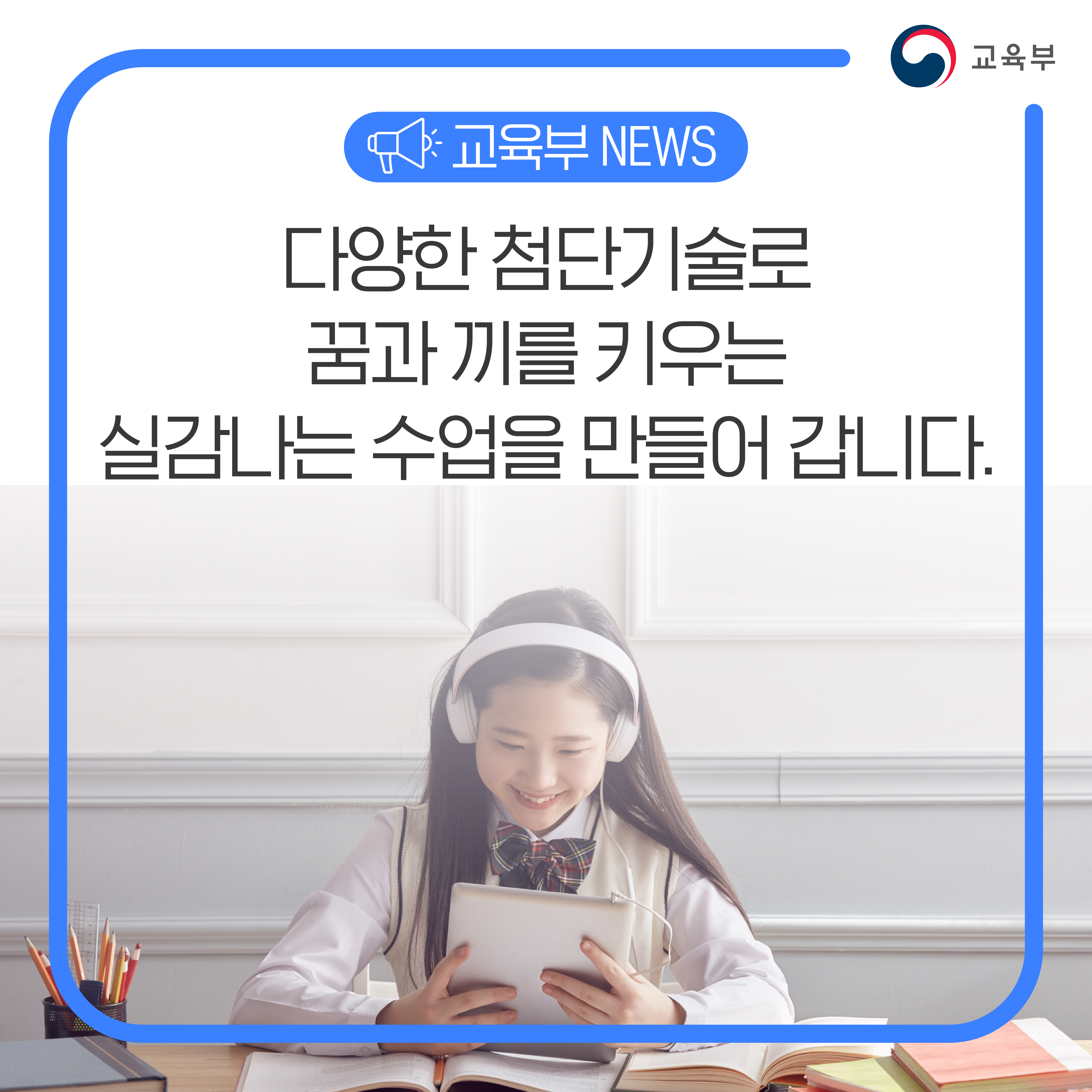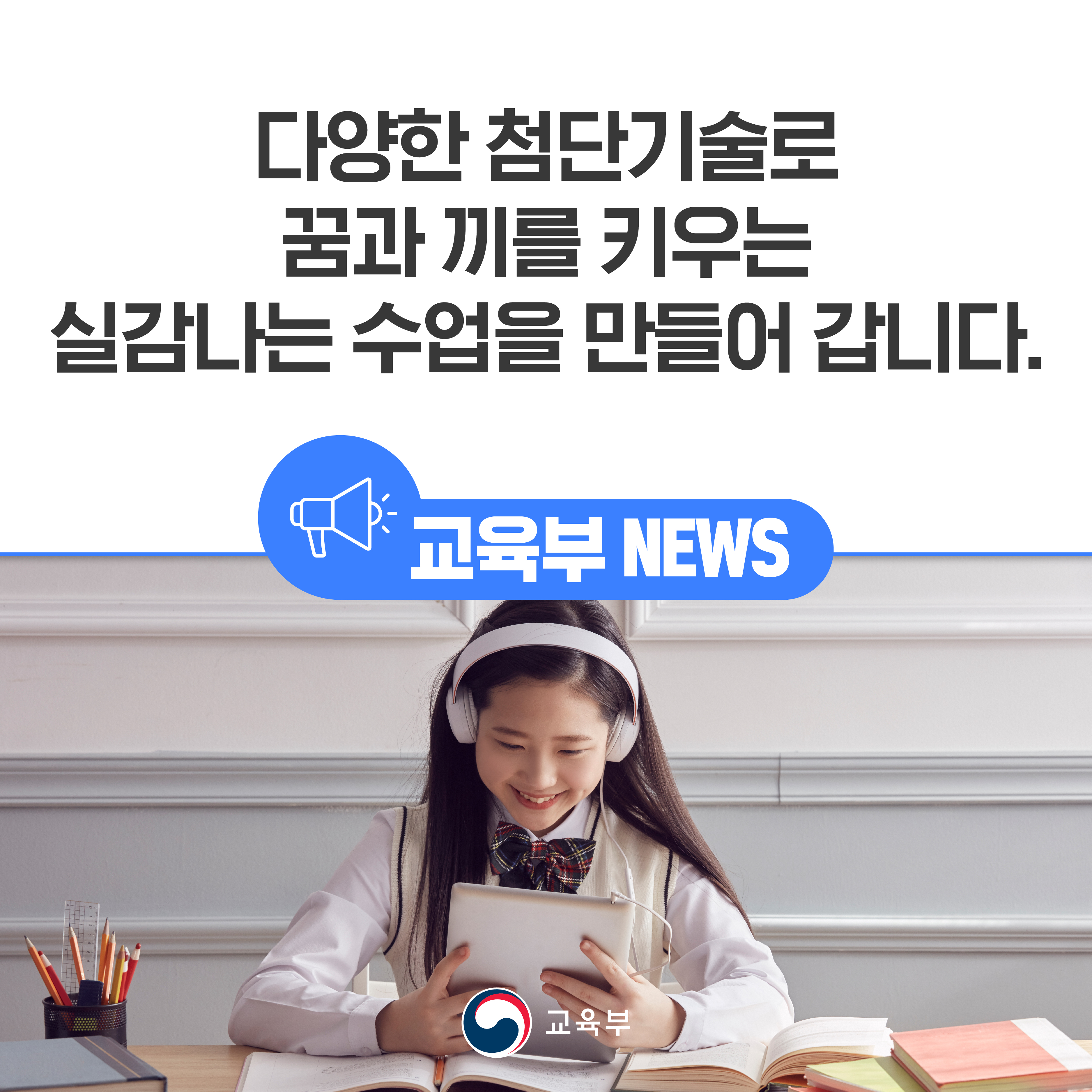 디지털 대전환 시대를 맞이하여, 교육부는 다양한 첨단기술을 교육 현장에 도입하여 학생들의 꿈과 끼를 길러주는 창의적인 수업을 실시하고 있다.