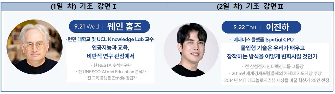 특히, 전 세계 인공지능 교육의 권위자인 런던대학교의 웨인 홈즈 교수가 ‘인공지능과 교육, 비판적 연구 관점에서’를 주제로, 증강현실 협업 플랫폼 스페이셜의 공동창업자인 이진하 대표는 확장가상세계(메타버스)가 교육에 미칠 영향에 대해 기조강연을 진행한다.