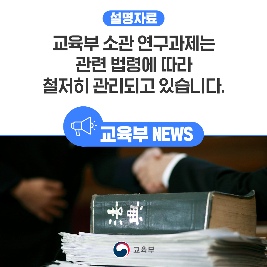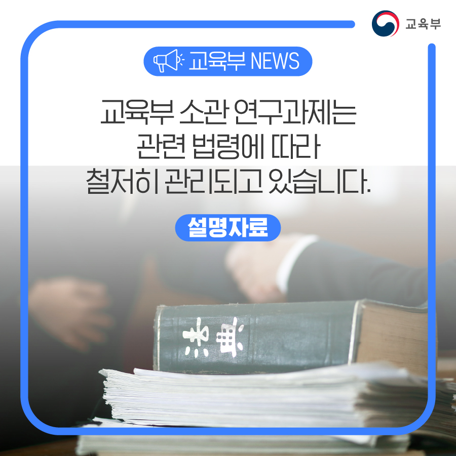 앞으로도 교육부는 관련 법령 등에 따라 사업 관리를 철저히 하겠으며, 연구자의 연구 활동 지원을 통해 창의적 성과 창출에 최선을 다하겠습니다.