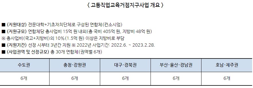 교육부는 국정과제인 ‘이제는 지방대학 시대’ 추진에 따라, 2022년부터 고등직업교육거점지구사업을 신규 사업으로 추진하고 있다.
