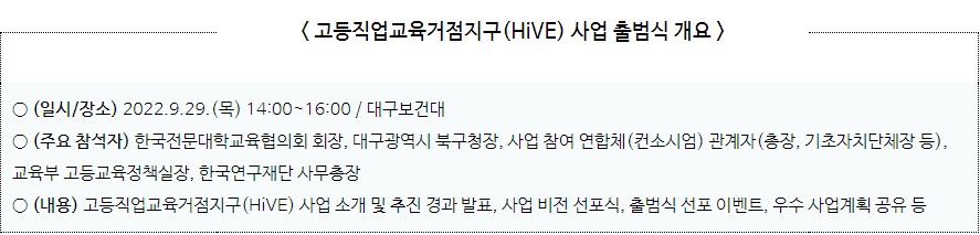 교육부는 9월 29일(목), 대구보건대학교에서 ‘고등직업교육거점지구(HiVE) 사업’ 출범식을 개최한다.