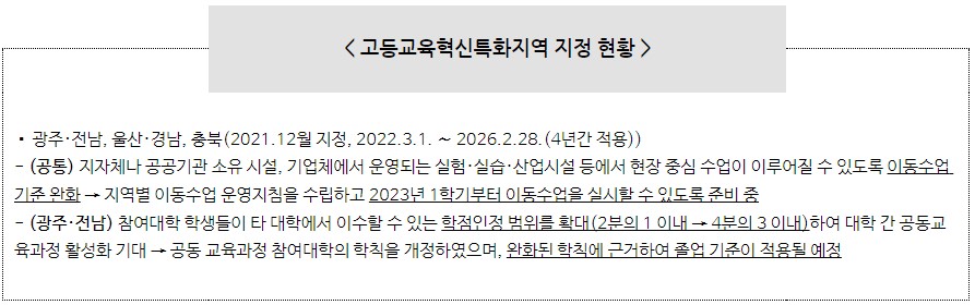 교육부는 대한민국 어디서나 잘 사는 지방시대를 만들어 가고자 국정과제(85. 이제는 지방대학 시대)를 통해 지역 실정에 맞는 고등교육모델을 수립할 수 있도록 지역별 맞춤형 규제특례(규제완화 또는 배제) 제도인 ‘고등교육혁신특화지역’의 확대 계획을 밝힌 바 있다.