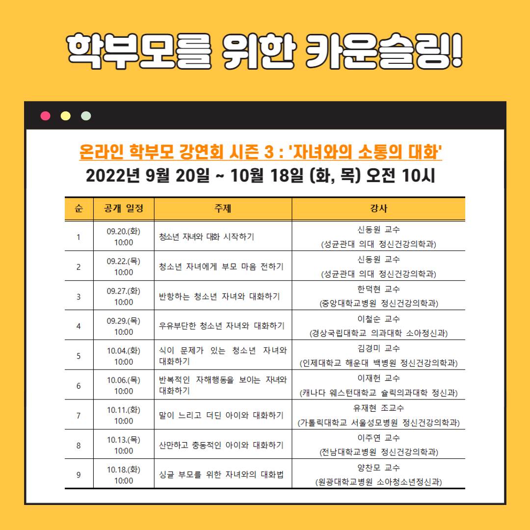 시즌1(2021.3.8.~26.)에서는 ‘새 학기 우리 아이 돌보기(9강)’를 주제로, 시즌2(2021.10.12.~11.4.)에서는 ‘10대 자녀를 둔 부모를 위한 카운슬링(12강)’을 주제로 진행되었는데요. 이번 온라인 학부모 강연회 시즌3은 국내 정신건강 전문의들이 청소년들의 상담 빈도가 높은 문제를 해결하기 위한 ‘자녀와의 소통과 대화’를 주제로 진행되고 있습니다.