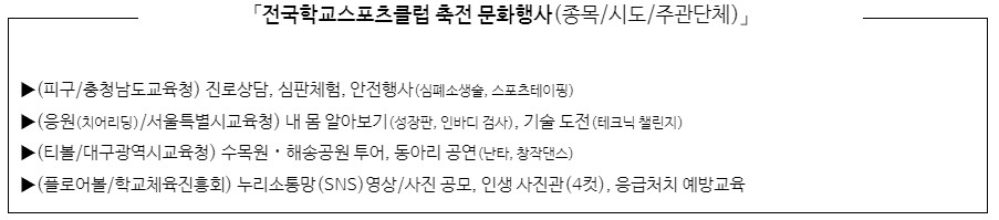 아울러, 신체활동 참여를 어려워하는 학생들도 쉽게 체육활동에 참가할 수 있도록 비대면 전국학교스포츠클럽 축전도 운영한다.