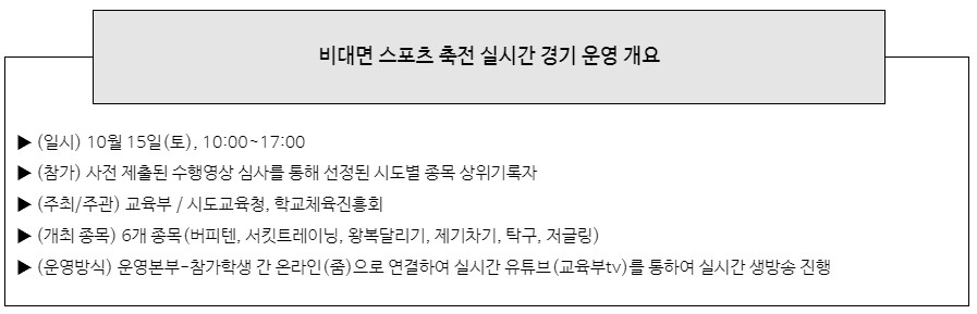 교육부는 시도교육청과 함께 10월 15일(토), 비대면 실시간 경기를 시작으로 11월 27(일)까지 6주간에 걸쳐 전국학교스포츠클럽 축전을 대면과 비대면 방식으로 병행 개최한다.