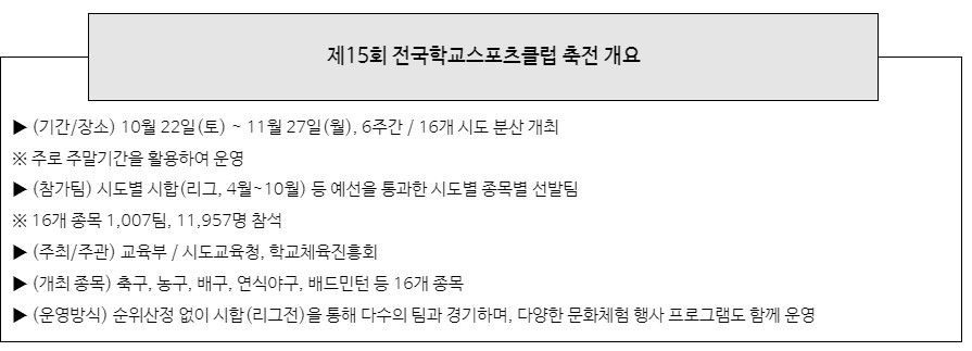 이번 행사는 학생들의 희망과 수요를 반영하여, 학생들의 참여*가 높은 16개 종목을 중심으로 운영되며, 시도별로 시합(리그, 2022.4월~10월)을 거쳐 선발된 학교(팀)가 참여한다.
