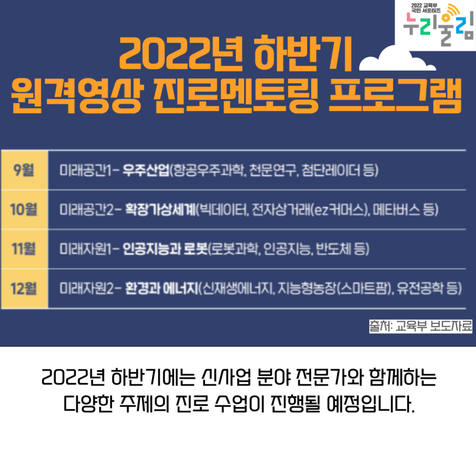 교육부는 신산업 분야의 전문가와 함께 다양한 주제의 진로 수업을 12월 23일(금)까지 온라인으로 제공할 예정입니다. 9월 ‘우주산업’을 시작으로, 10월 확장 가상 세계(메타버스), 인공지능과 로봇, 환경과 에너지 등 매월 새로운 주제로 원격영상 진로멘토링을 운영합니다. 학생들은 온라인에서 다양한 분야별 전문가들을 만나 진로에 대한 고민을 함께 나눌 수 있습니다.