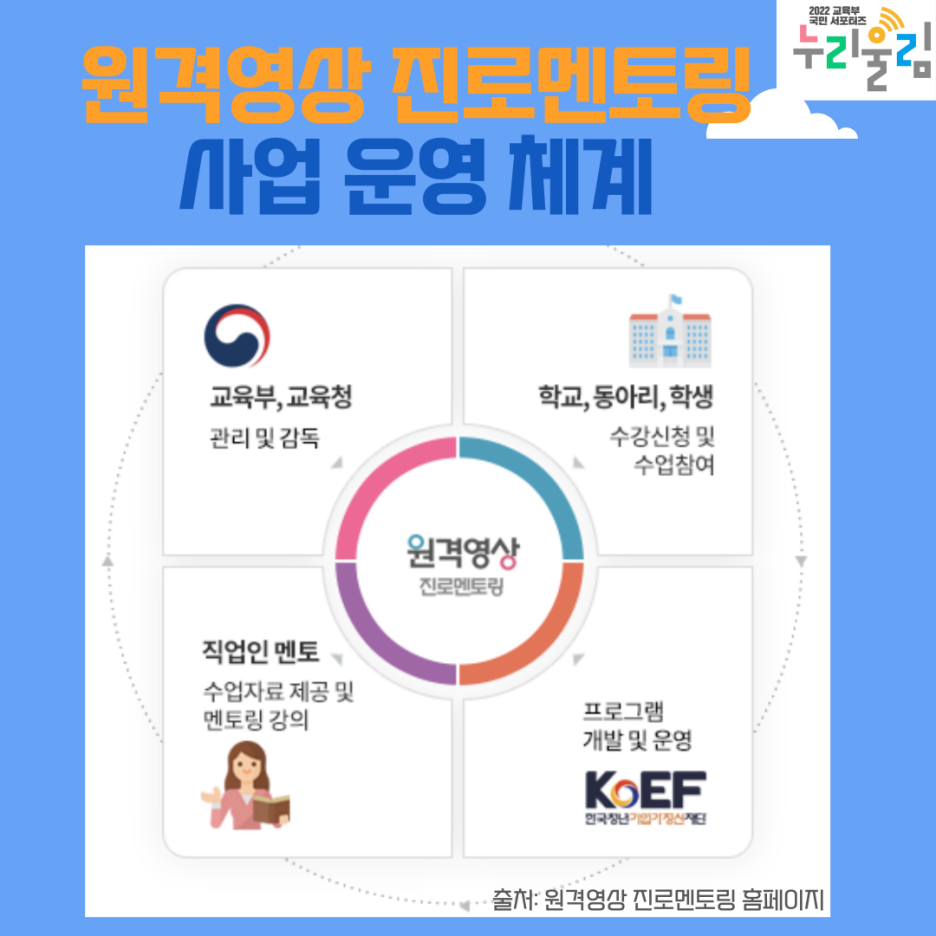 교육부는 2013년부터 ‘원격영상 진로멘토링’ 사업을 시작하여, 2015년에는 1,500회, 2019년에는 1,757회 그리고 2021년에는 무려 2,309회의 진로멘토링 수업을 꾸준하게 지원하고 있습니다. 또한, 매년 문화·예술·디자인·방송 등 다양한 직업별 전문가(멘토) 300여 명이 참여하는 진로 수업을 운영하고 있습니다.