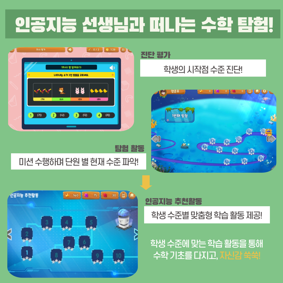 인공지능 선생님은 학생의 시작점 수준을 진단하는 '진단 평가'와 각종 과제를 수행하며 현재 수준을 파악할 수 있는 '탐험 활동'을 기반으로 학생 수준에 맞는 맞춤형 학습 활동을 합니다. 이 활동을 통해 학생들은 수학 기초를 다지고 자신감도 키울 수 있게 됩니다.